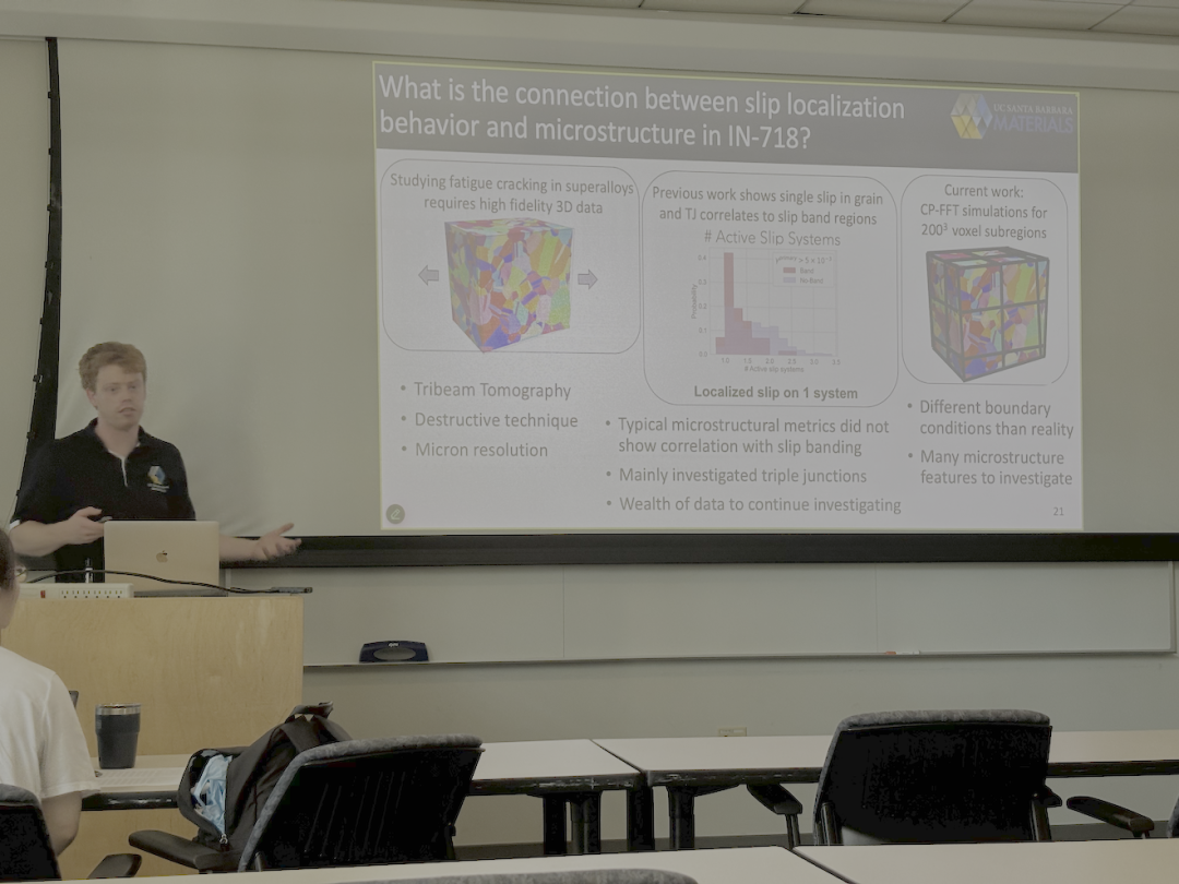 4th year graduate student Nico Fuchs-Lynch gave a presentation at UCSB's Graduate Simulation Seminar Series (GS^3). His talk was on a Crystal Plasticity Fast-Fourier Transform (CP-FFT) model to probe slip localization development in precipitation-hardened IN-718. Using highly resolved 3D EBSD data (TriBeam) and CP-FFT modeling, subregions of the 3D dataset in uniaxial tension are simulated and a criteria for identifying grains with a high propensity to develop slip localizations was determined based on previous combined experimental and simulation work.